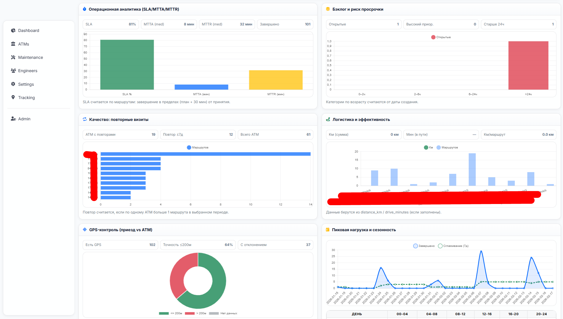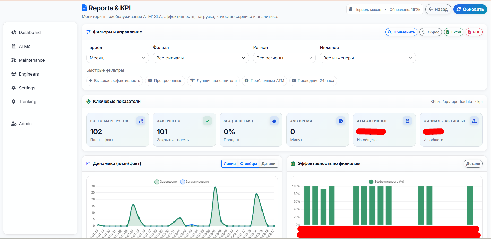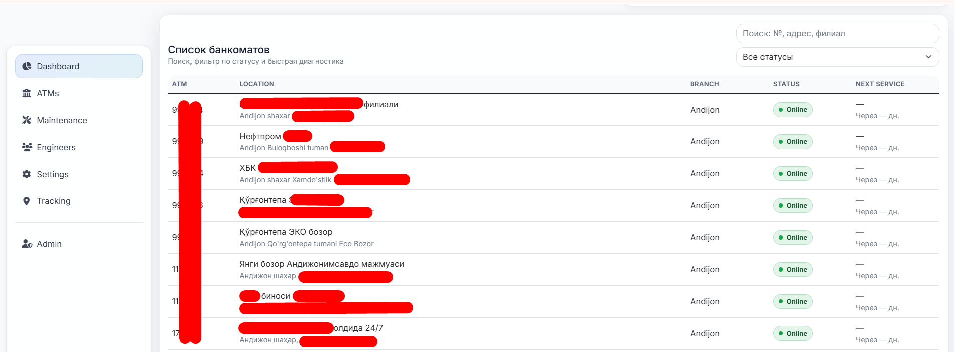 - ATM: номер, адрес, модель, координаты (lat/lon), связь с филиалом