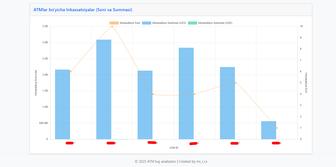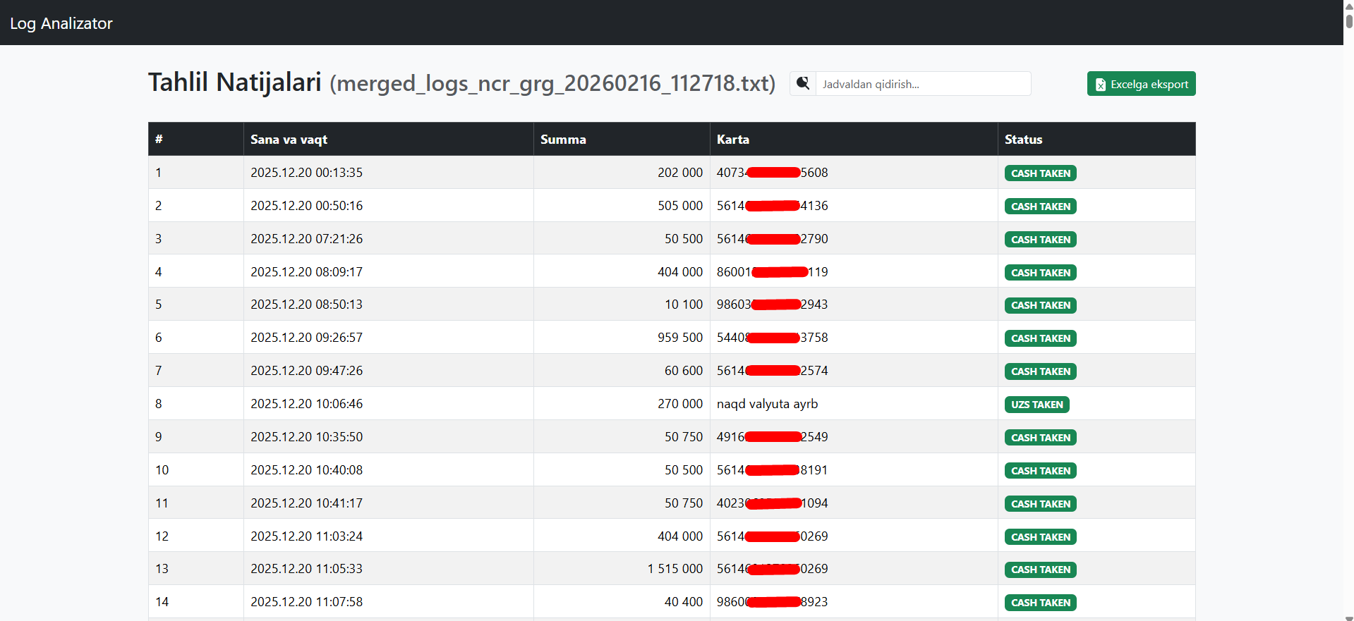 - Парсинг и извлечение ключевых полей (дата/время, тип операции, сумма, данные карт/кассет — в рамках доступного в логах)